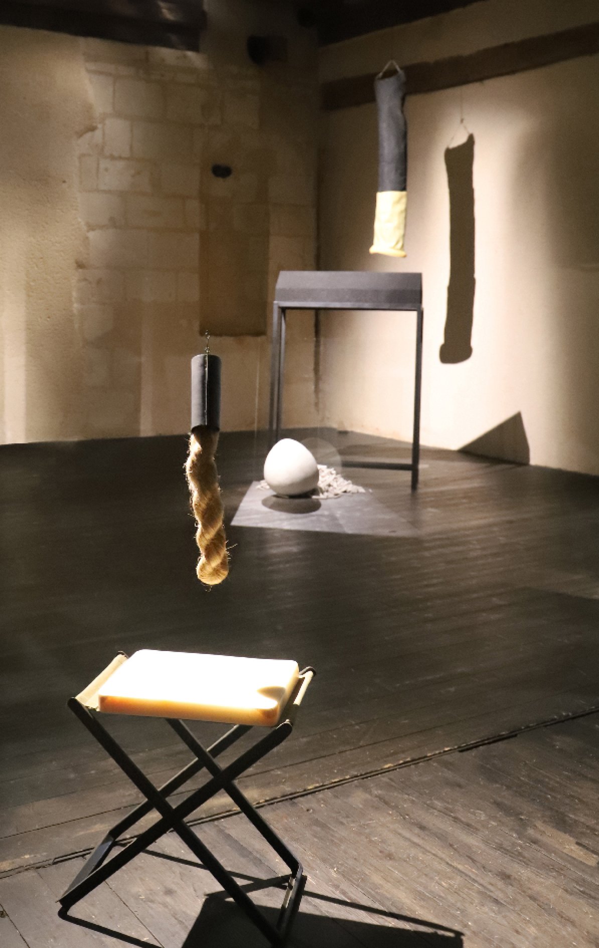 Dans le silence d’une ancienne chapelle, la Galerie Chapelle Sainte Anne à Tours-La Riche, Marine Aïello et Alain Quesnel ont mis en œuvre un dispositif minimaliste mais profondément évocateur : des pièces en céramique suspendues par des fils discrets, de formes allongées, percées à leur extrémité, laissent s’écouler lentement des gouttes d’eau….Cette installation s’inscrit dans le cadre de leur exposition à quatre mains « Il Suono delle pietre ».