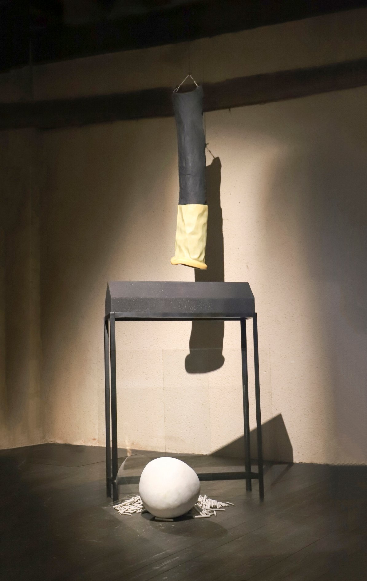On peut y voir une allégorie du corps humain : la céramique suspendue comme une tête ou une conscience, le plomb comme le corps qui reçoit, souffre, endure comme un écho à nos obsession contemporaines : celle du temps qui fuit, celle de la mémoire qui s’infiltre, celle du poids invisible des jours. Le son amplifié agit comme une résonance intérieure, une conscience du poids de chaque instant.